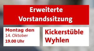 Liebe Mitglieder und Interessierte, wir laden euch herzlich ein zu unserer nächsten Vorstandssitzung am Montag den 14. Oktober 2019 um 19.00 Uhr im Kickerstüble Wyhlen Langetränkeweg 1, 79639 Grenzach-Wyhlen. Wir freuen uns auf euer Kommen, Vorstand SPD Grenzach-Wyhlen
