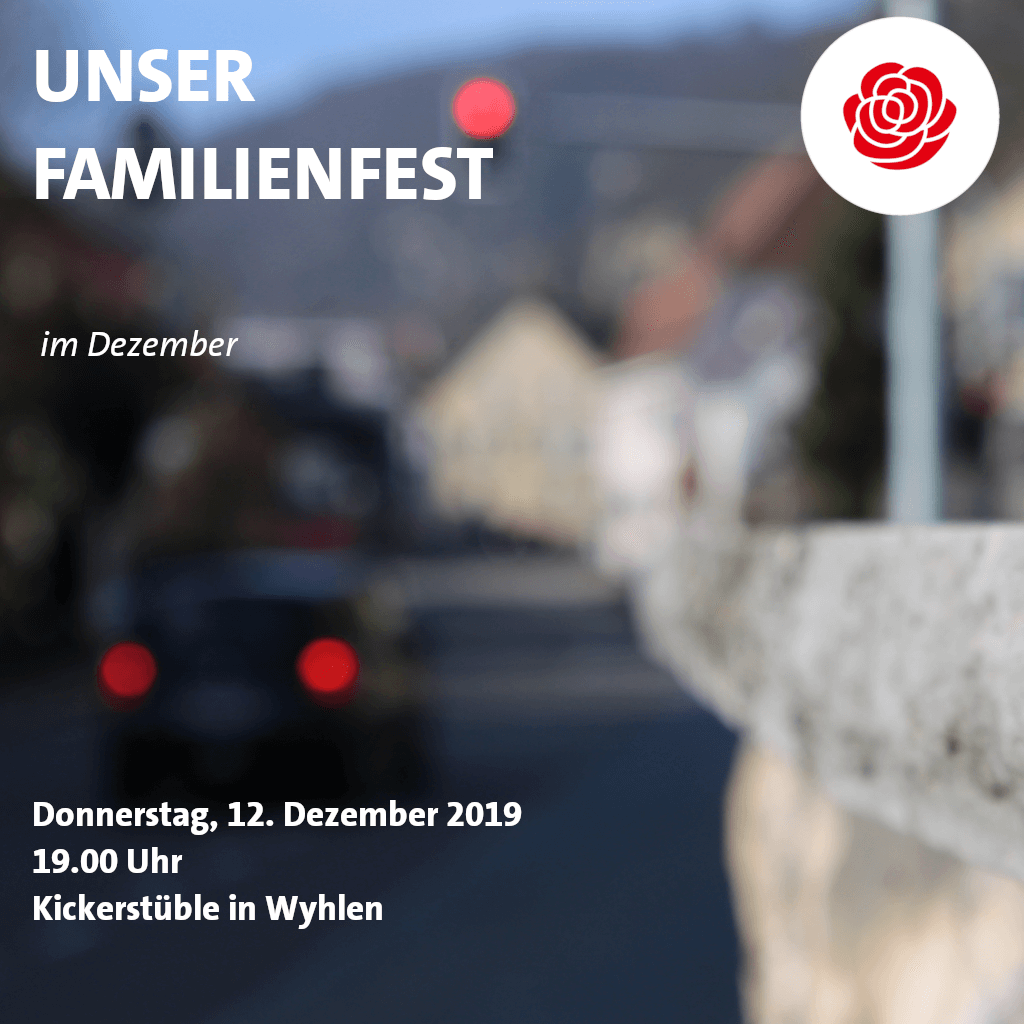 Liebe Genossinnen und Genossen, zum Abschluss dieses Jahres mit Wahlen, verstärkten Internetauftritten, Einbindung der Jungen, Stammtisch und deutlichen Erfolgen wollen wir alle zusammen unsere SPD in Grenzach-Wyhlen feiern. Junge und Alte begegnen sich, alte Freunde sehen sich wieder, Neue lernen uns kennen, einfach unser Familienfest. Dazu ein kurzer Film, eine kurze Ansprache und viel „Ziit zum Schwätze“. Wir vom Vorstand hören euch zu, lernen von euch und beantworten eure Fragen. Wir sind überzeugt, dass die SPD eine junge Politik für…