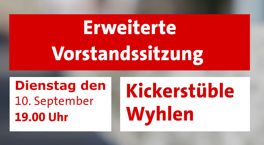 Liebe Mitglieder und Interessierte, Am 23.09. findet im Kickerstüble im Ortsteil Wyhlen eine öffentliche Sitzung der SPD-Gemeinderatsfraktion zur Vorberatung der Gemeinderatssitzung am Tag darauf statt. Interessierte Bürgerinnen und Bürger sind herzlich dazu eingeladen.